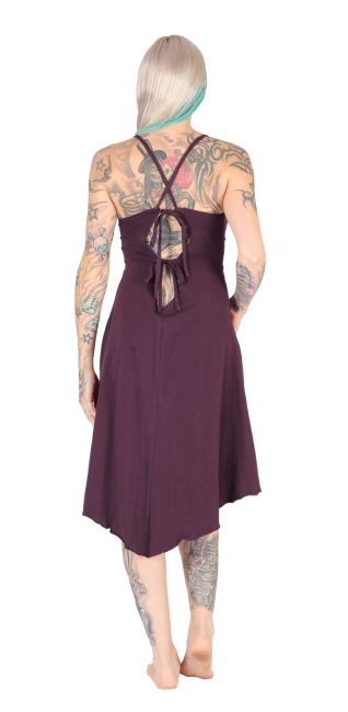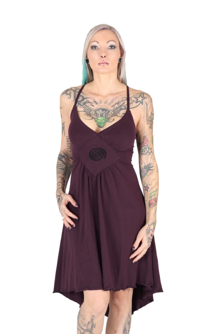 Rückenfreies weit fallendes Devi Design Kleid im gewohnten Tribal Design im Farbton Pflaume. Das Rückenteil ist länger als der Vorderseite geschnitten. Auf der Fronseite befindet sich eine zweifarbige Spirale Dekoration. Von der Dekoration aus formen Falten das Kleid zu einer schönen Körperumschmeichelnden Form aus.